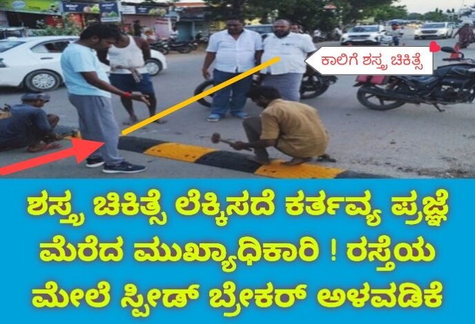 ಕಾಲಿನ ಶಸ್ತ್ರ ಚಿಕಿತ್ಸೆ ನಡುವೆ ಕರ್ತವ್ಯ ಪ್ರಜ್ಞೆ ಮೆರೆದ ಅಧಿಕಾರಿ ! ಪಟ್ಟಣದಲ್ಲಿ ರಸ್ತೆಯ ಮೇಲೆ ಸ್ಪೀಡ್ ಬ್ರೇಕರ್ ಅಳವಡಿಕೆ